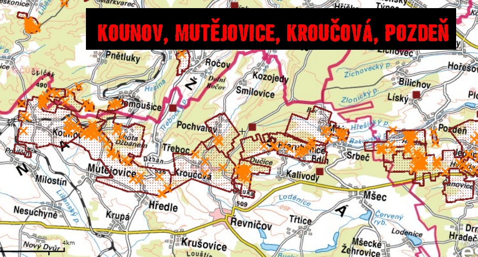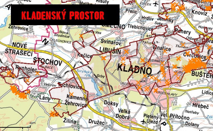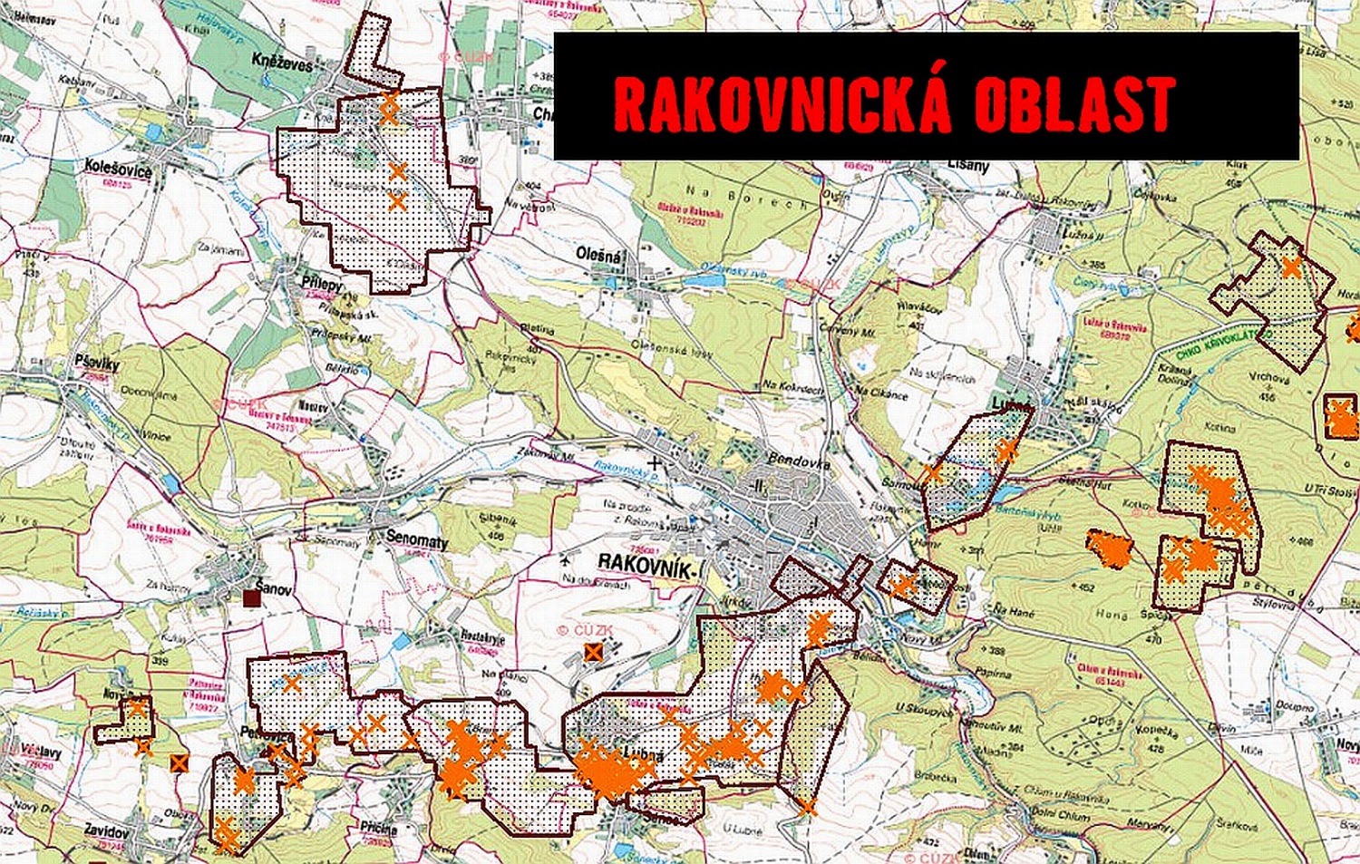 Obrázek pochází ze stránek České geologické služby (odkaz na ni najdete v sekci oblíbených vlevo dole) a jedná se o znázornění vlivů důlní činnosti. Žluté křížky jsou důlní díla (jámy, štoly), hnědé plošky jsou poddolovaná území. Tyto barevné pásy na mapě krásně vyznačují těžený prostor Kladensko-slánsko-rakovnické uhelné pánve. Mimochodem – současné počty evidovaných důlních děl se pohybuje okolo tisícovky…